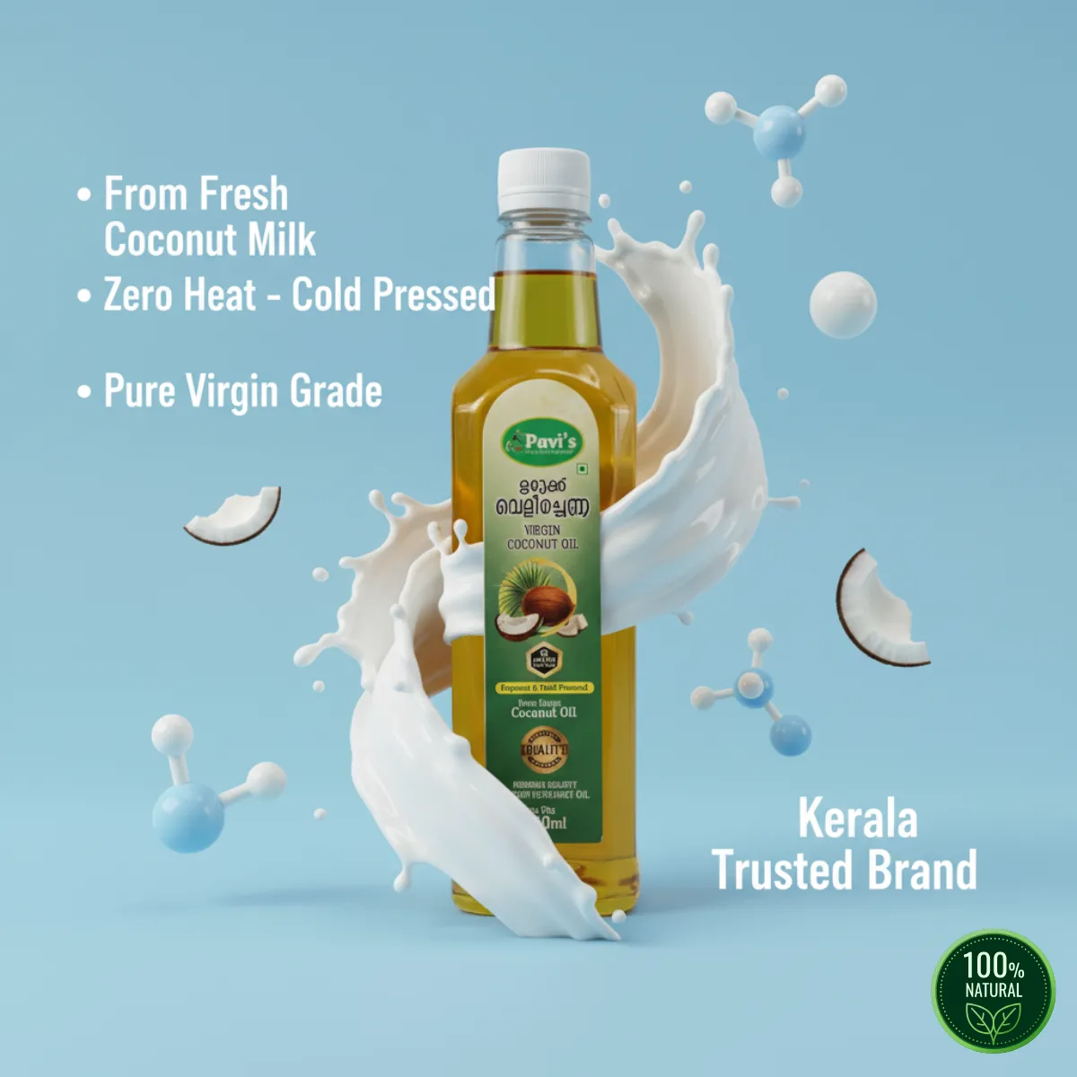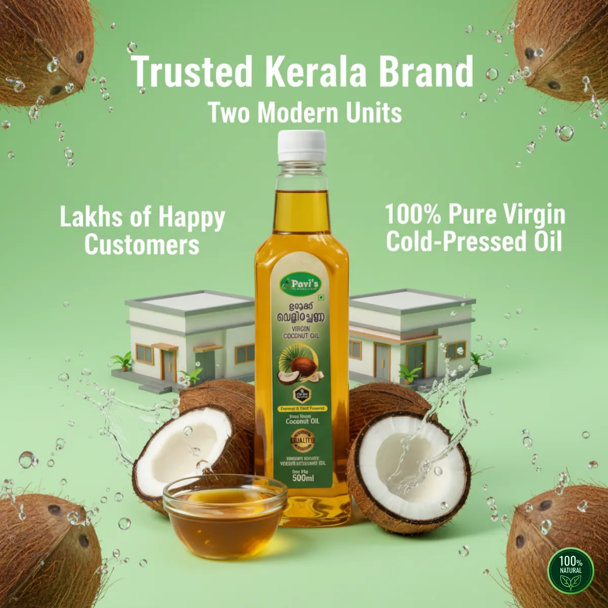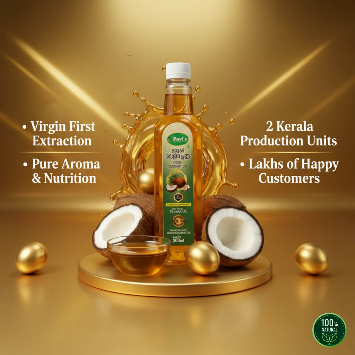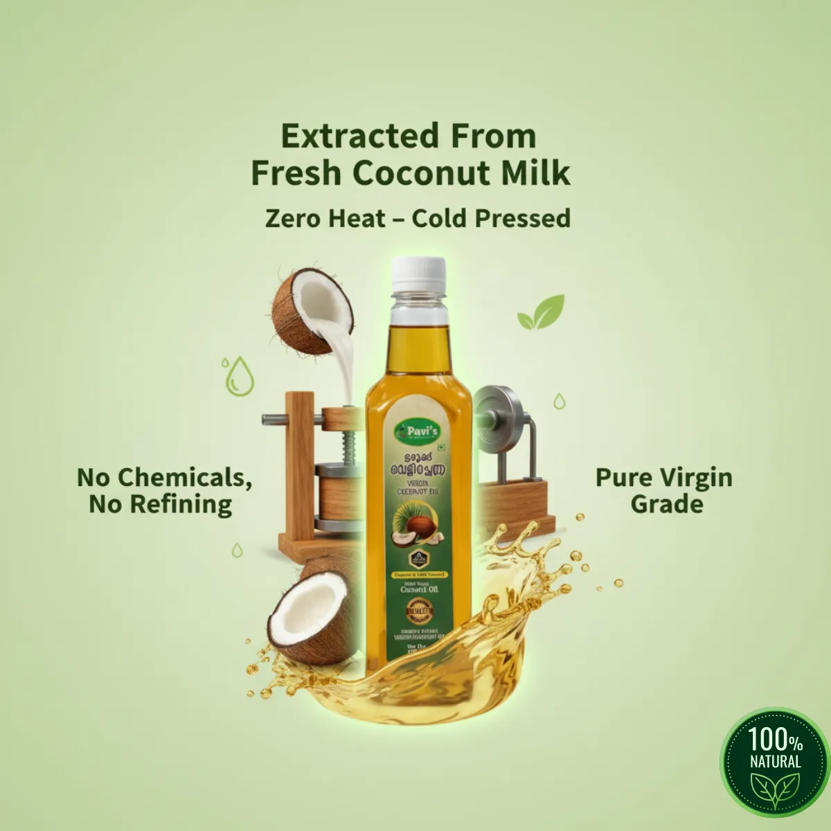 Pavis Virgin Coconut Oil – Pure cold pressed Kerala coconut oil. Made in two modern manufacturing units, established in 2020. 100% pure, unrefined, chemical-free. Ideal for cooking, hair care, baby care and skincare.