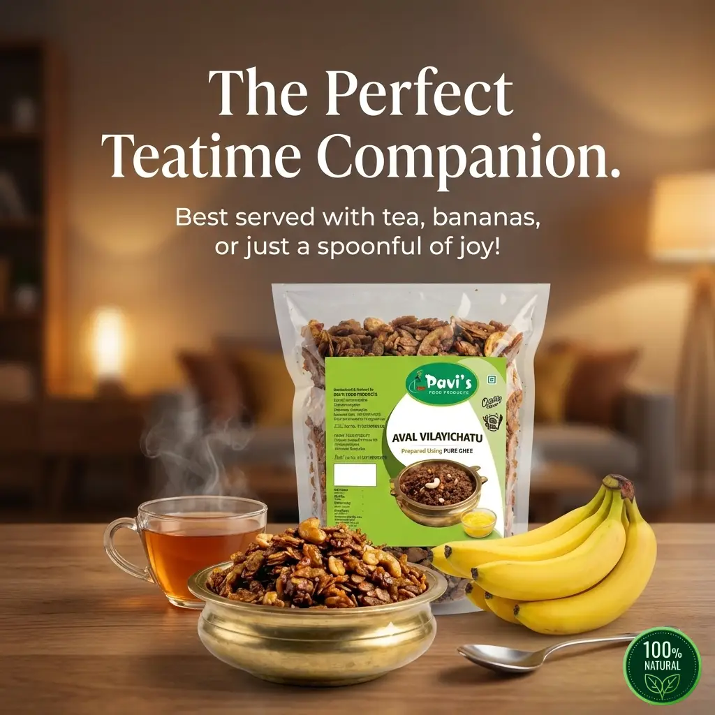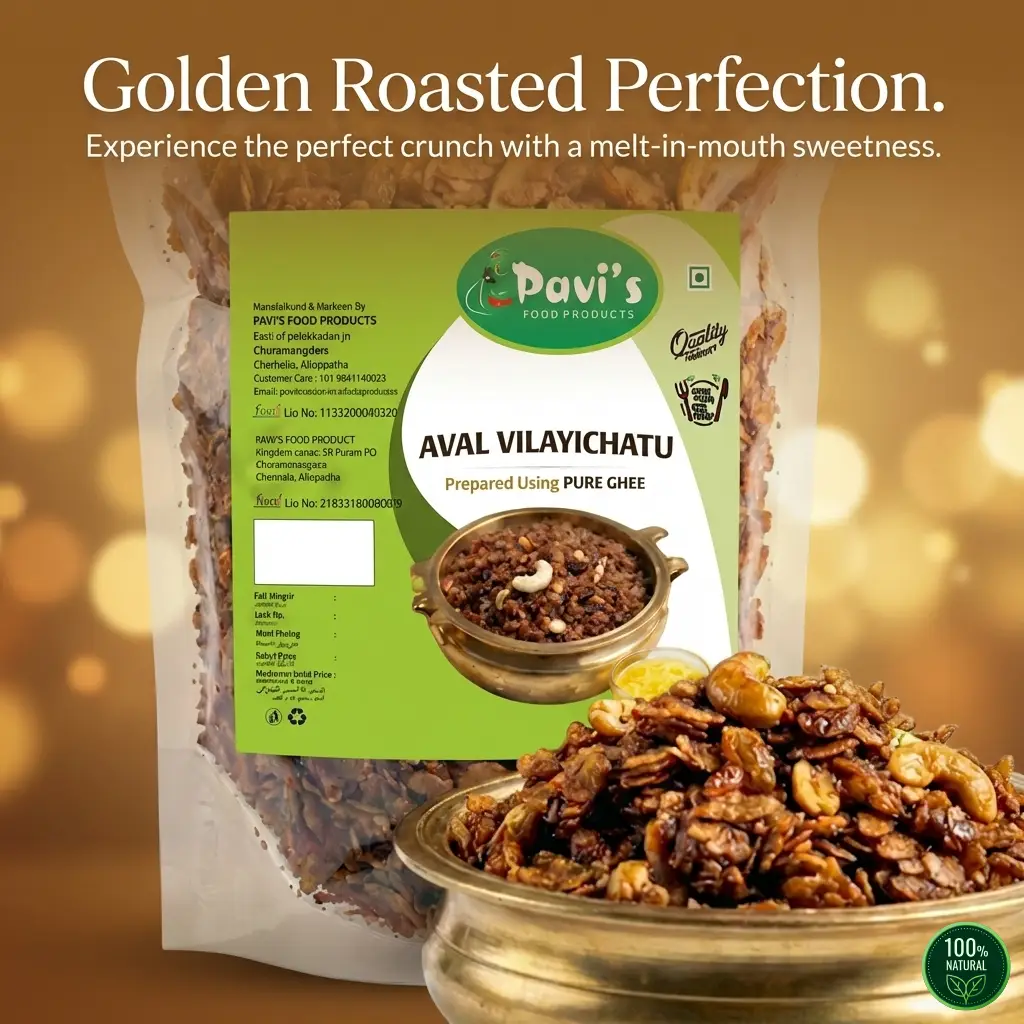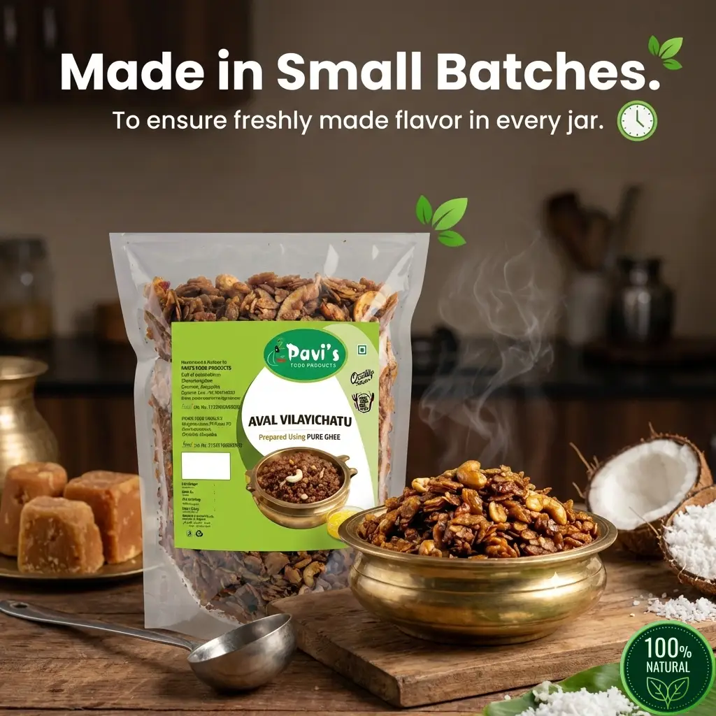 Bring home the nostalgic flavor of Kerala’s beloved tea-time snack. Pavi’s Aval Vilayichathu is prepared using premium quality beaten rice (Aval), natural jaggery, fresh coconut, and aromatic cardamom for a perfectly crunchy and sweet experience.