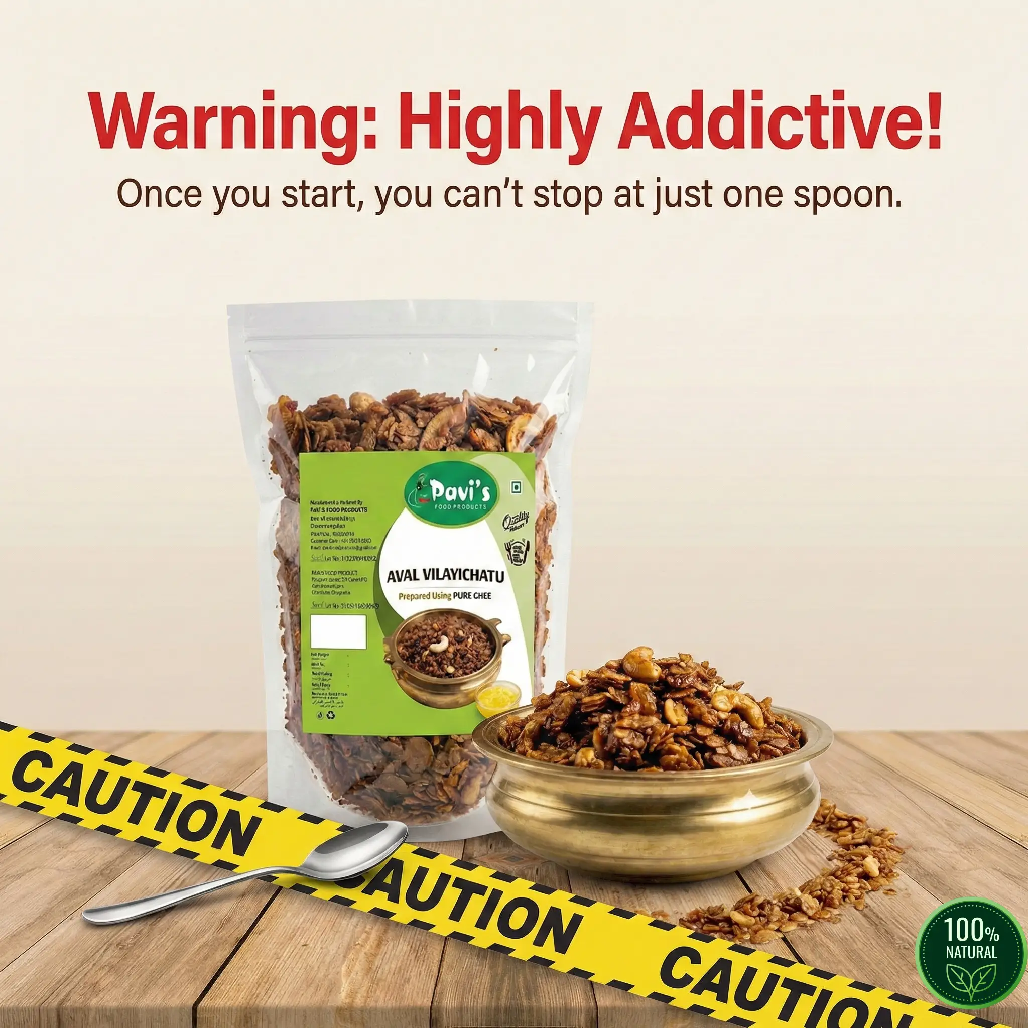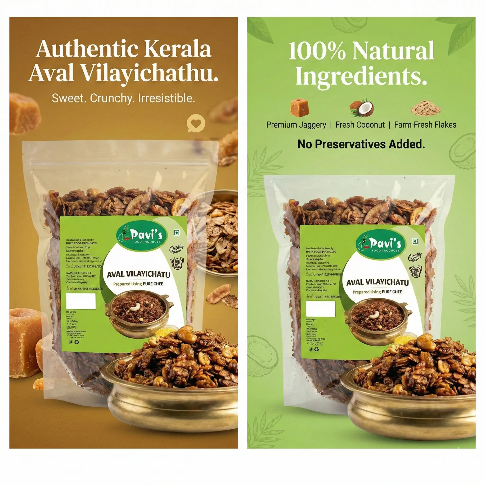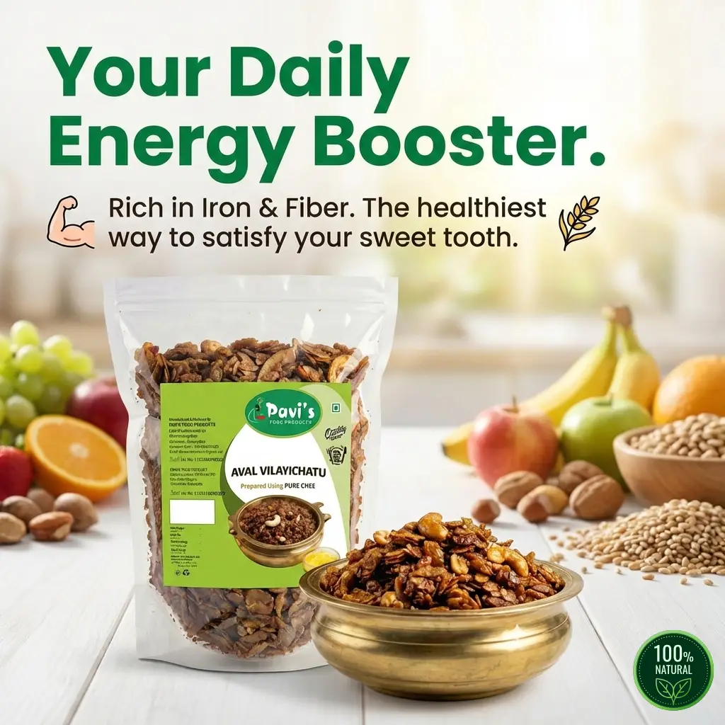 Bring home the nostalgic flavor of Kerala’s beloved tea-time snack. Pavi’s Aval Vilayichathu is prepared using premium quality beaten rice (Aval), natural jaggery, fresh coconut, and aromatic cardamom for a perfectly crunchy and sweet experience.
